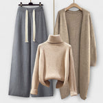 • Conjunto completo de 3 peças – Inclui um suéter de gola alta, um cardigã longo e uma calça de cintura alta e perna larga para um look harmonioso.